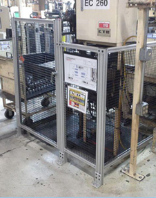 T-Slotted aluminum, black wire mesh panels, and a keyed interlock to keep employees out of catch points